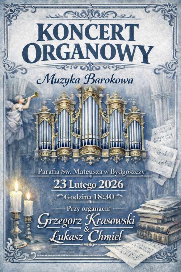 W poniedziałek 23 lutego, zapraszamy na Koncert Organowy Muzyka Barokowa o godz. 18.30 w naszym kościele. Przy organach Grzegorz Krasowski i Łukasz Chmiel.
